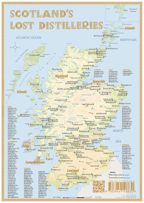 Die Whisky Distilleries sind in mehrere Kategorien unterteilt und auf der Karte farblich gekennzeichnet. Die Vorderseite zeigt aktive und geplante Produktionsstätten, die Rückseite geschlossene Brennereien.